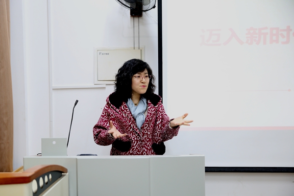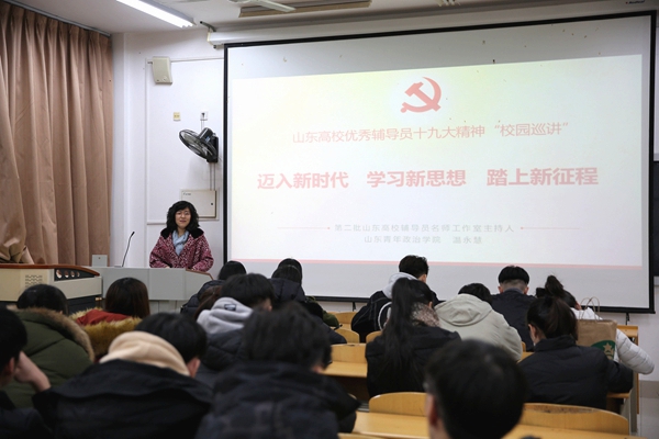 温永慧以“迈入新时代、学习新思想、踏上新征程”为主题,围绕青年学生如何找准新时代的历史坐标、把握社会矛盾新判断、学好理论新思想、踏上人生新征程四个方面,展开党的十九大精神宣讲。首先,温永慧将党的十九大主题总结为“三个意味着”、“五个是”、“当青春遇上新时代”三个方面。新时代对于青年而言,应该是奋力前行、建功立业的时代。她从“找准历史新坐标”、“把握矛盾新判断”、“学习理论新思想”、“踏上人生新征程”四个角度全面阐述了新时代、新使命、新征程的含义。并提出大家要在初心中坚守理想、要在时代中善于创新、要在实干中增长才干、要在斗争中展现担当。温永慧精彩的讲解让同学们深受鼓舞,她强调作为新时代青年要时刻保持昂扬向上的精神状态和一往无前的奋斗姿态,面对任务不推诿,面对困难不退却,面对矛盾不回避,面对挫折不放弃,始终坚定理想信念、勇于担当,做新时代的奋进者、开拓者、奉献者,承载起国家和民族的光明未来。