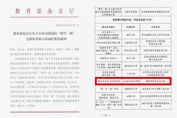 舞蹈学院作品《舞动的支部,坚定的信仰》确定为全国高校“两学一做”支部风采展示活动“推荐展示精品作品”。