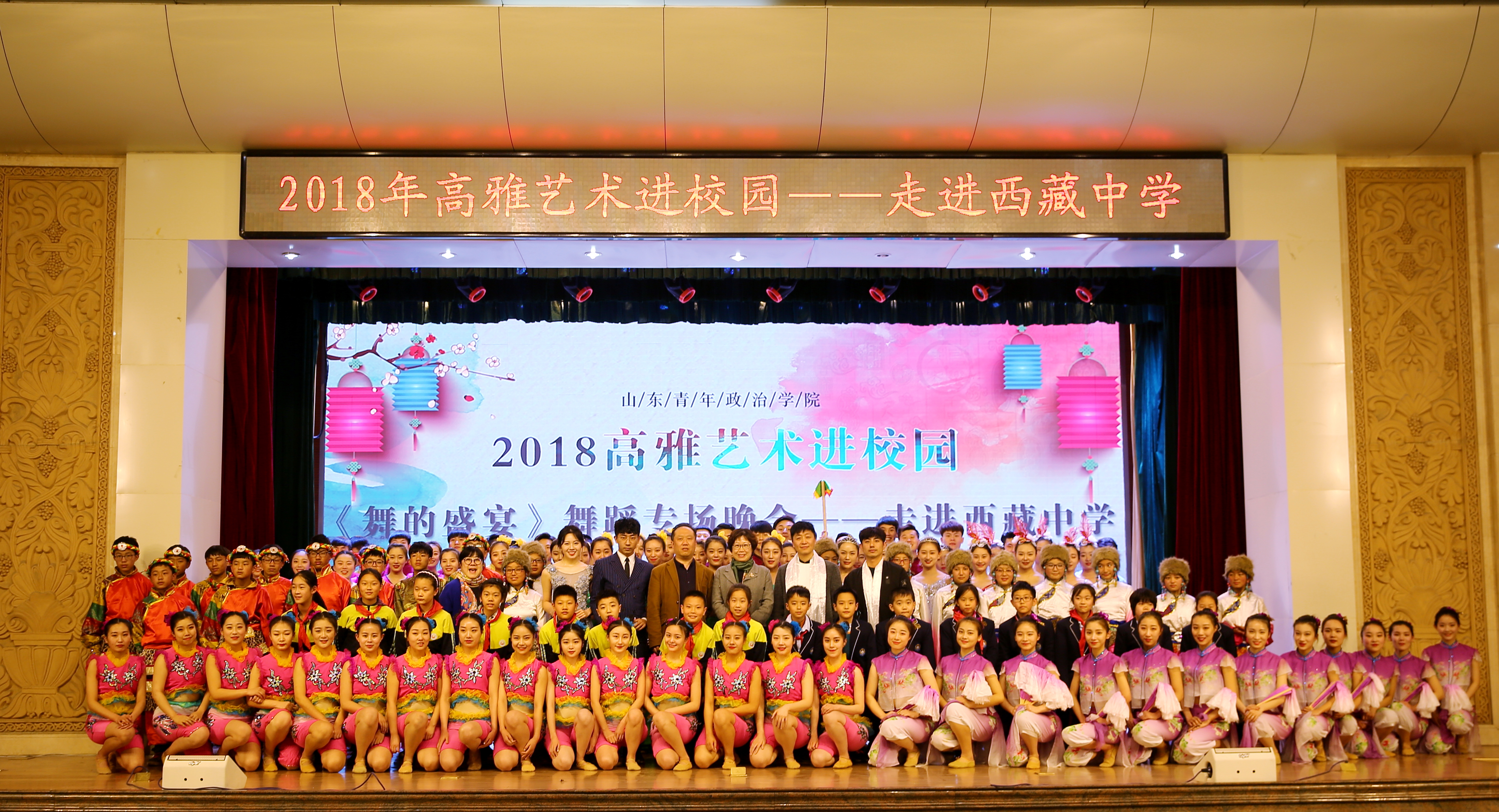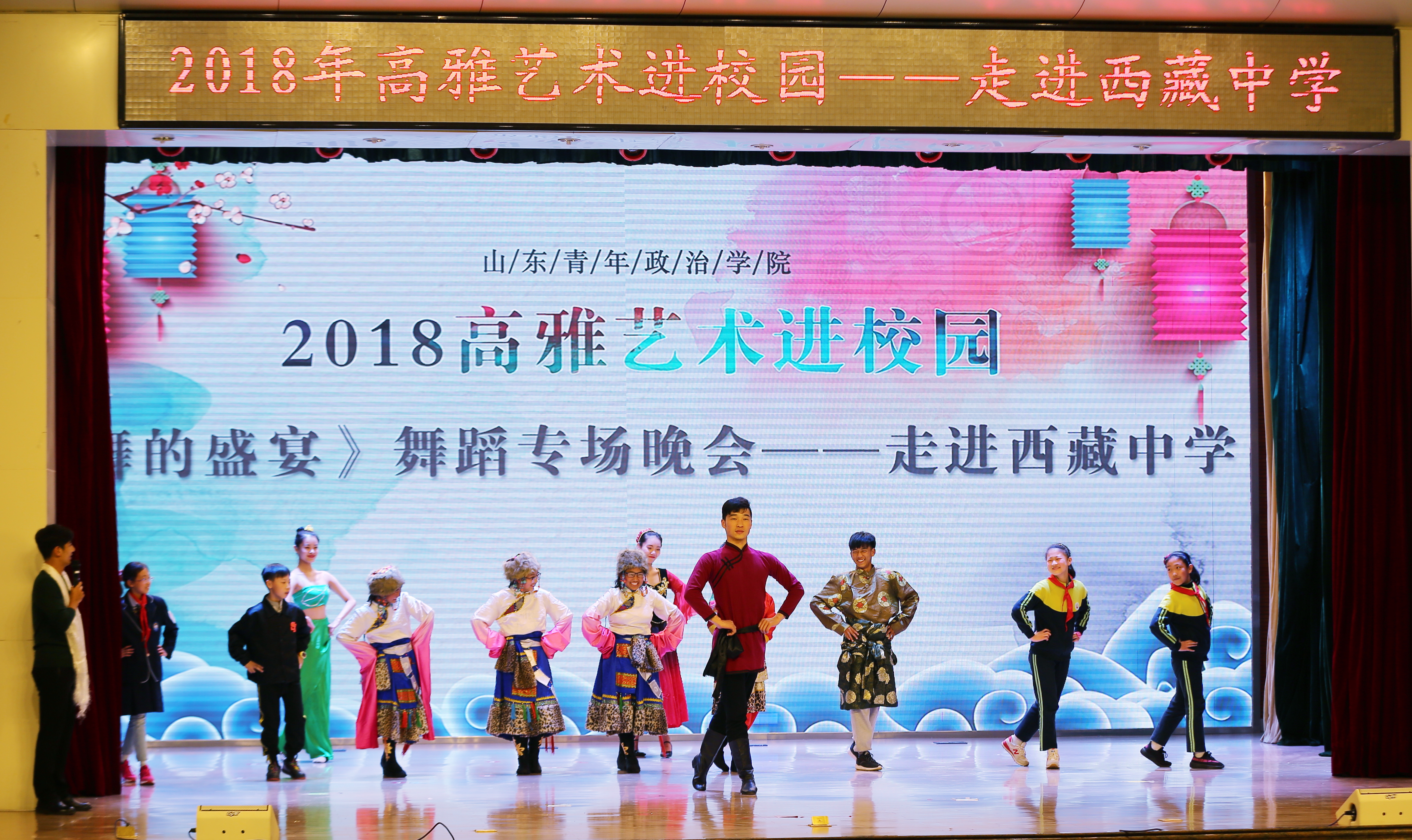 演出开始前,西藏中学的同学们带来了热情似火的群舞《跳起你的舞》,并为大家献上哈达,向大家送上了最真挚的祝福。西藏中学校长郭永军致欢迎词,他对山东青年政治学院师生的到来表示热烈欢迎,并祝演出圆满成功。山东青年政治学院舞蹈学院院长傅小青介绍了近几年我院高雅艺术进校园活动的情况,希望本次活动伴随着西藏中学浓厚的校园文化氛围,让艺术在同学们的心中开花结果。同时山东青年政治学院舞蹈学院与西藏中学的同学们相互学习着各民族的民间舞蹈动作,从不一样的角度带领大家体验民族舞蹈的韵味。随后,演出在舞蹈《万紫千红中国年》中拉开帷幕。晚会上,有表现女子婀娜形象的《春之花》,有展现男子豪迈形象的《父亲的背影》,有演绎基本功训练的《我们从这里出发》,表现亲情离别之苦的《娘的眼泪》,配合默契的双人舞《啷哩个啷》等,连连将演出推向高潮。最后,晚会在大型舞蹈集锦《五彩缤纷舞春天》中结束,藏族舞蹈、维吾尔族舞蹈、傣族舞蹈与山东的胶州、海阳、鼓子秧歌汇集一堂,台下的同学们也跟随音乐一起舞动,现场成为一片欢乐的海洋。