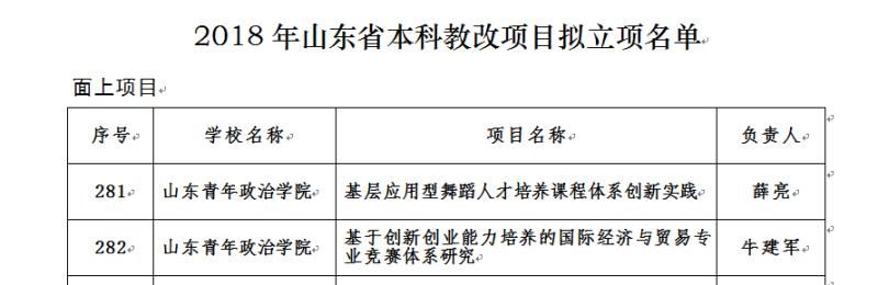 根据《山东省教育厅关于做好本科教改项目立项和管理的通知》(鲁教高字〔2018〕2号)的要求,教育厅组织开展了2018年度山东省本科教学改革研究项目评审工作。依据教育厅专家评审的结果,我院教学科研管理办公室主任薛亮主持申报的《基层应用型舞蹈人才培养课程体系创新实践》获批。