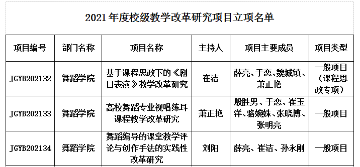 根据学校《关于公布2021 年度校级教学改革研究项目立项结果的通知》(山青院教通字(2021)76号),我院青年教师萧正艳主持申报的《高校舞蹈专业视唱练耳课程教学改革研究》、崔洁主持申报的《基于课程思政下的<剧目表演>教学改革研究》、刘阳主持申报的《舞蹈编导的课堂教学评论与创作手法的实践性改革研究》3个项目获得立项。