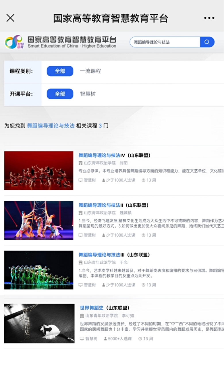 此次入选教育部国家级高等教育平台首批上线课程,实现了舞蹈学院课程建设在国家层面零的突破。今后,学院将总结不足继续前进,不断攻克在课程建设上面临的难题,充分发挥省级教学成果奖的示范带头作用,推进一流专业建设,一流课程建设,助力推进学院教育教学形式科学化、层次化、多样化,为山东省教育工作作出更大的贡献。
