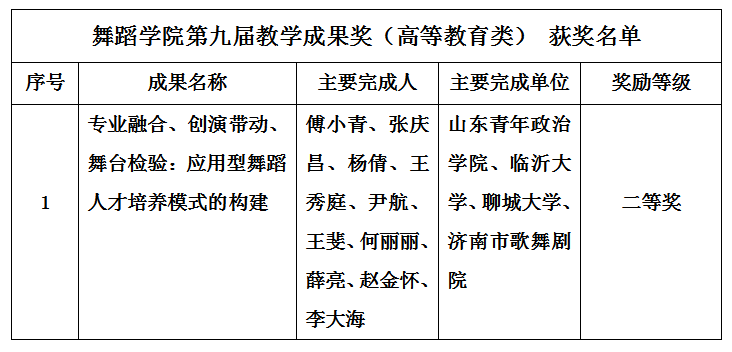 近日,山东省教育厅发布了《关于公布山东省第九届教学成果奖(高等教育类)获奖名单的通知》(鲁教高字〔2022〕1 号),舞蹈学院申报的《专业融合、创演带动、舞台检验:应用型舞蹈人才培养模式的构建》获得山东省第九届教学成果二等奖。