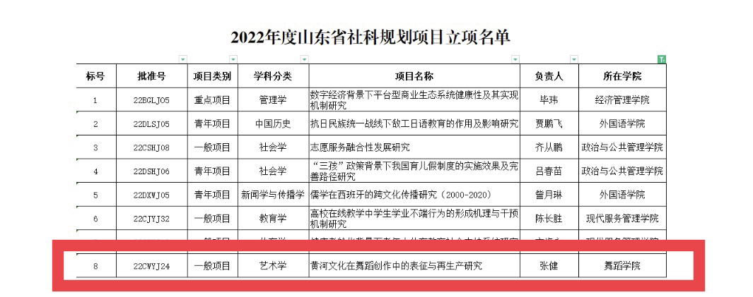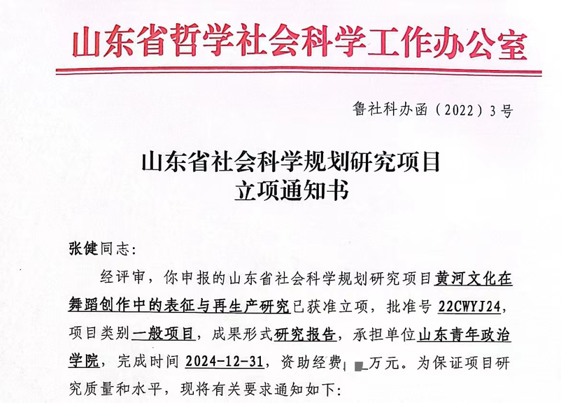8月25日,山东省哲学社会科学工作办公室正式公布了2022年度山东省社科规划年度项目立项名单,舞蹈学院张健副教授的艺术学项目《黄河文化在舞蹈创作中的表征与再生产研究》获批立项。