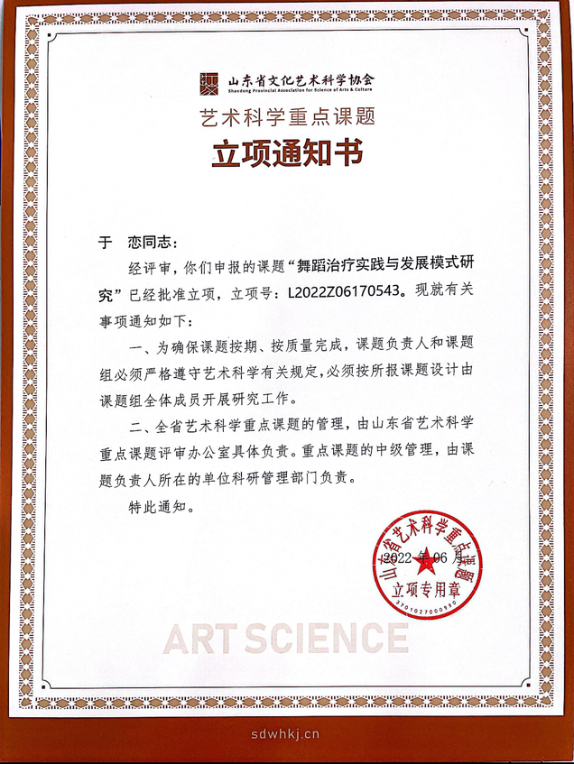 近日,在由山东省文化艺术科学协会主办的艺术科学重点课题研究项目中,舞蹈学院教师于恋申报的“舞蹈治疗实践与发展模式研究”获批立项。本次立项负责人和课题组严格遵守艺术科学的有关规定,积极开展研究工作,并在预期完成时间内完成研究任务,取得高重点课题研究成果。