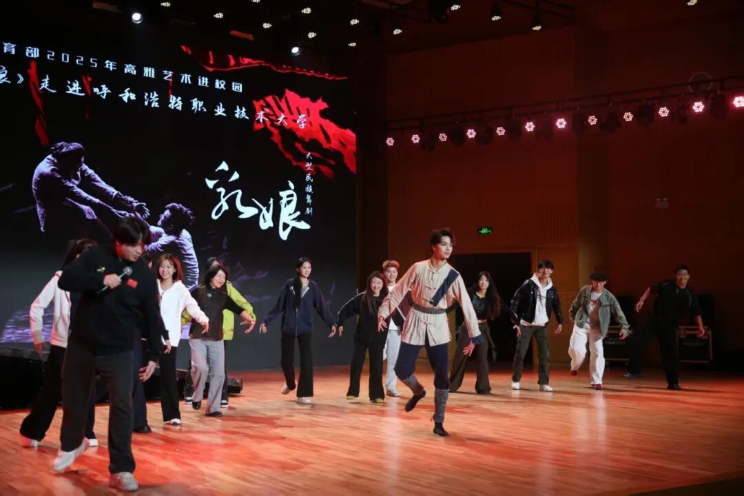 我校原创舞剧《乳娘》成功入选2025年“教育部文化和旅游部财政部高雅艺术进校园活动”,并先后走进呼和浩特职业技术大学、呼和浩特市第十四中学开展美育浸润活动。活动以艺术为桥梁传递红色精神,创新采用“演出+互动+讲堂”多维形式,推动高雅艺术深度浸润师生心灵,实现红色教育与文化传承的有机融合,为两地校园注入浓郁的艺术气息与精神力量。