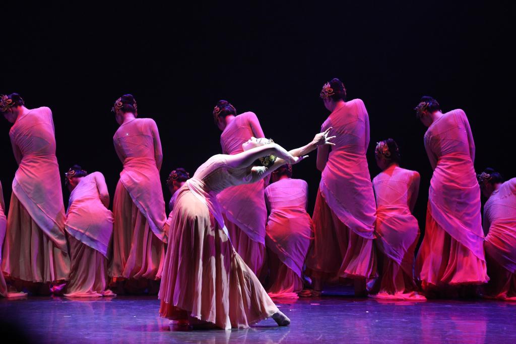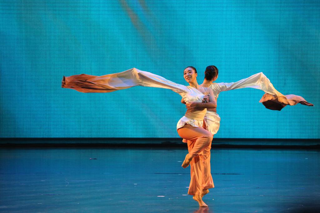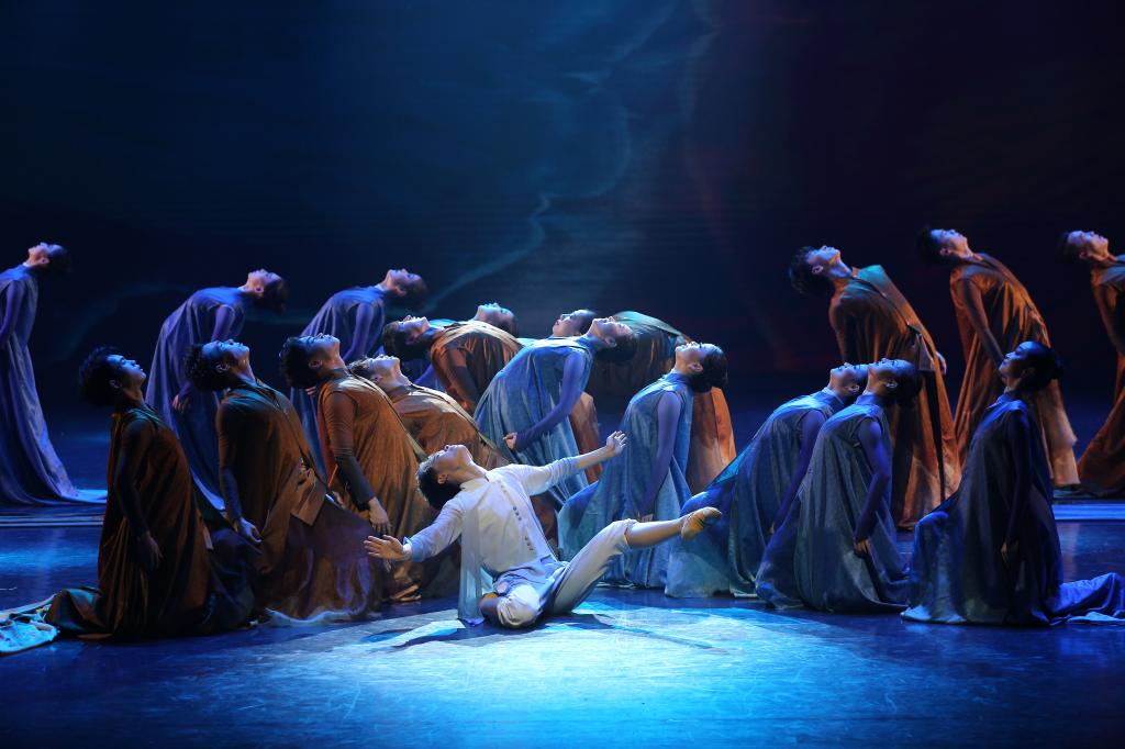 上篇《源起》——芭蕾舞《水的述说》,舒缓的旋律节奏,将舞者的动作展现的优美、舒展,与音乐情绪十分契合;古典舞《流淌的歌》,以中国古典舞的语言形式和身法韵律为基础,赋予动作新颖独特的个性化特征,对黄河也有了不一样的演绎;现代舞《奔腾的黄河》,运用简单、平易、通俗的舞蹈语汇,清晰地表现出黄河的奔流不息。