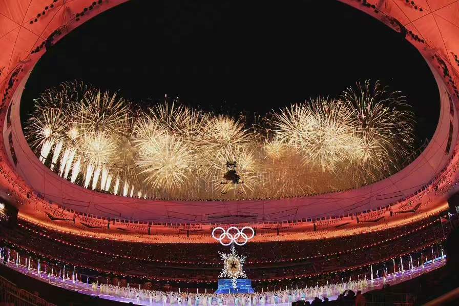 在闭幕式尾声阶段,《友谊地久天长》《我们在一起》《燃烧的雪花》的旋律在鸟巢上空唱响,志愿者们拉着手围成圈舞蹈,现场的观众在暖意融融的歌声中有序退场,北京冬奥会在“中国式浪漫”中闭幕。