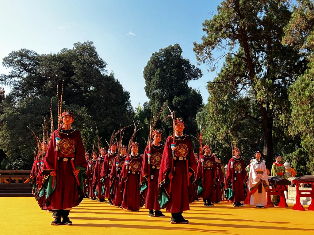 上午9时,由专家学者、海内外孔子后裔等组成的祭祀队伍,统一佩戴黄色绶带,从孔庙外的神道开始向万仞宫墙行进。在万仞宫墙前广场,新编开城仪式《和合大同》精彩亮相,寓意“美美与共,天下大同”的孔子理想世界。