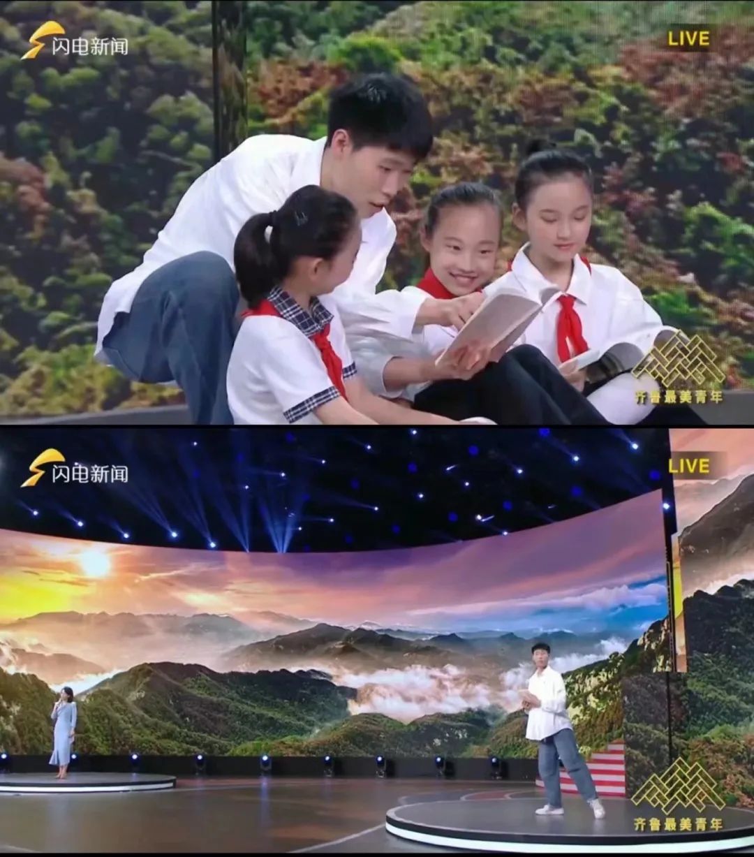 随着“沂蒙山”音乐的响起,舞蹈演员田立昊通过书本等道具和儿童演员互动,用精湛的表演和饱满的情感将乡村教师刘玉瑞帮助1500余名孩童们学习的事迹进行了完美演绎,表现了以身立教的教师形象。