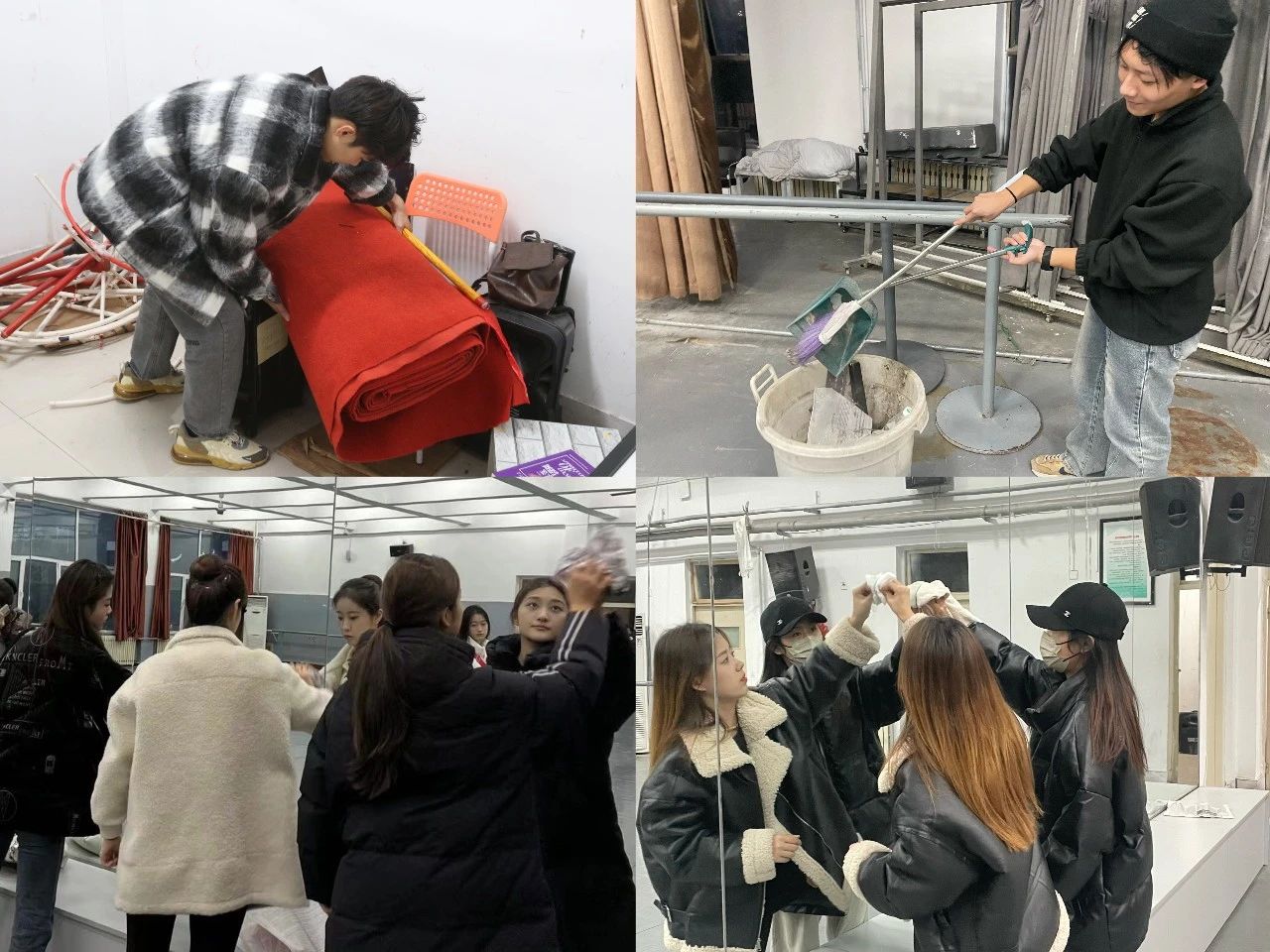党员以及学生骨干们干劲十足,带着清洁工具打扫着排练厅,不放过每一个角落,积极发挥先锋模范带头作用,带领大家一起把排练厅打扫干净,将鞋子摆放整齐,让教室重新焕发光彩。