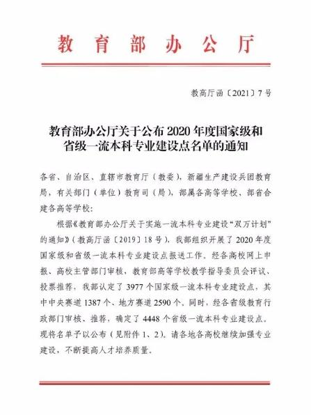 近日,《教育部办公厅关于公布2020年度国家级和省级一流本科专业建设点名单的通知》(教高厅函[2021]7号)正式公布了2020年度一流本科专业建设点名单。我校4个专业获批国家级一流本科专业建设点,实现了专业建设成果的重大突破。截至目前,我校共获批国家级、省级一流本科专业建设点8个,占全校本科招生专业总数的22.2%。其中,舞蹈学院舞蹈编导专业获批国家级一流本科专业建设点!