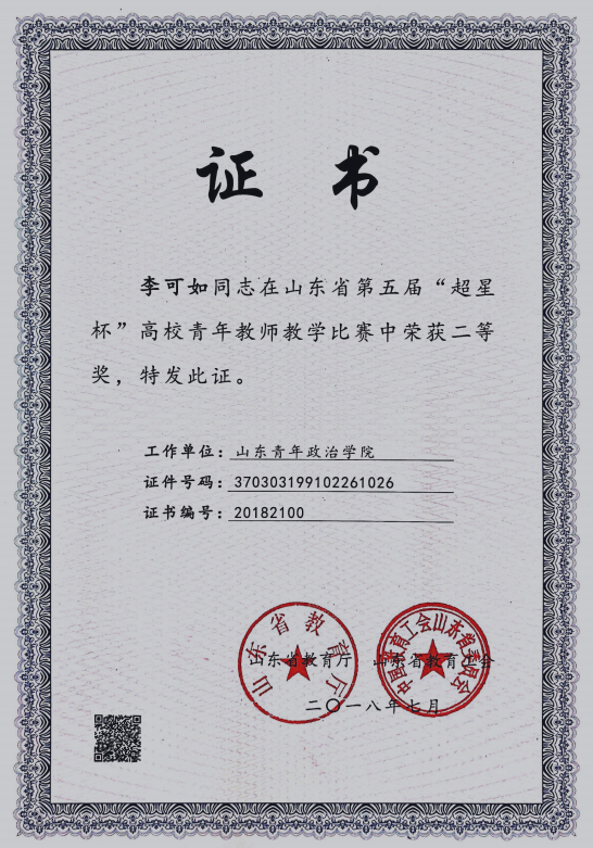 李可如荣获山东省第五届“超星杯”高校青年教师教学比赛二等奖